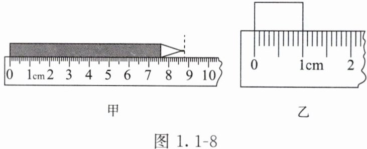 (2)图1.1 - 8乙是小红测量物块长度的情景,记录的物块长度为1.0 cm,小红记录的数据是否正确?答: