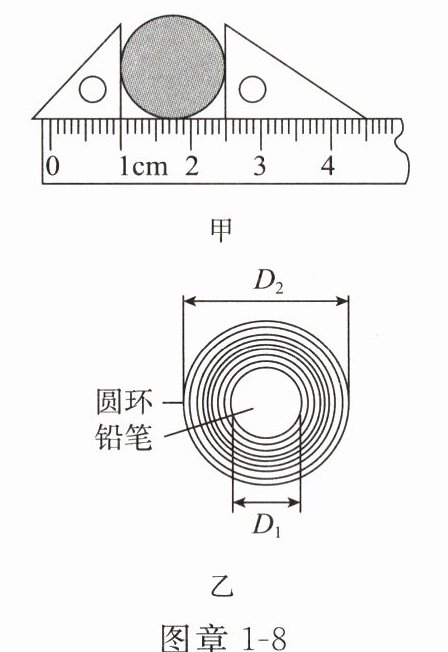 (2)一条纸带厚薄均匀,小亮把这条纸带紧密地环绕在圆柱形铅笔上,直至恰好能套进一个圆环中,如图章 1 - 8 乙所示。纸带环绕了 n 圈,则纸带厚度是