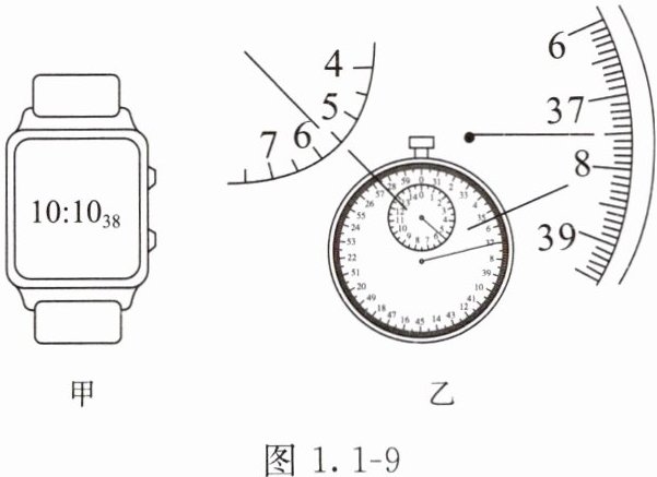 秒。热身结束后进行1000 m跑的训练,某同学1000 m跑的测试时间如图1.1 - 9乙所示,该机械秒表的大盘的分度值是0.1s