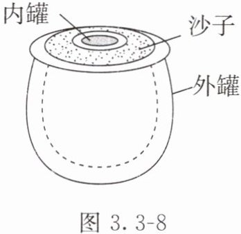 8. 学习小组的同学制作了一个可以不用电的“冰箱”,在一个大的陶罐里面放一个较小的陶罐,内外罐之间填有沙子,如图3.3 - 8所示。盛夏季节里,不利于给“冰箱”中食物降温的做法是(