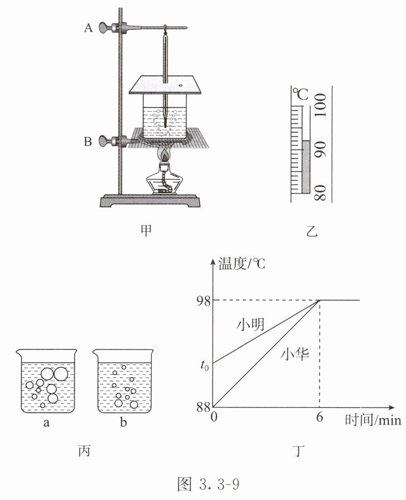 (选填“a”或“b”)。(4)小明和小华利用同一装置进行实验,绘制成温度—时间图像如图3.3 - 9丁所示,分析图像可知:水的沸点与初温