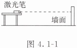 (1)如图4.1-1所示,将激光笔固定在小桌上沿水平方向照射,用喷壶向激光笔的前方喷水,看到激光笔发出的一束红光射向墙面,墙面上有一个红色光点保持不动。