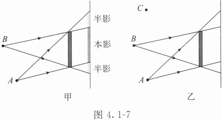 晚上在教室内只打开一盏日光灯,仔细观察你自己的影子,会发现影子中部特别黑暗,四周稍浅。影子中部,日光灯发出的光不能照到,特别黑暗,叫本影。四周灰暗的部分叫半影。将2支蜡烛点燃,并分开放置于课桌上A、B两个位置,蜡烛前面立一本书,关掉日光灯可以看到墙壁出现书的本影和半影,如图4.1-7甲所示。如果点燃3支甚至4支蜡烛,书的本影部分就会逐渐缩小,半影部分会出现很多明暗不同的层次。