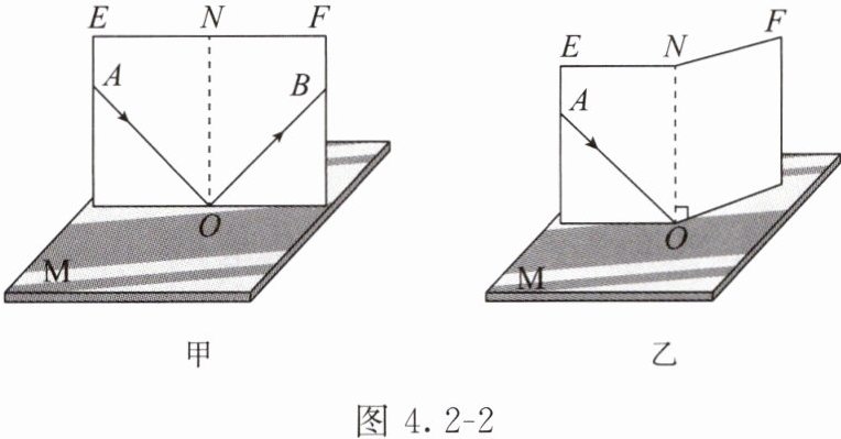 的。(2)图 $ 4.2 - 2 $ 乙中,以法线 $ ON $ 为轴线,把纸板 $ NOF $ 向后缓慢旋转,在 $ NOF $ 上