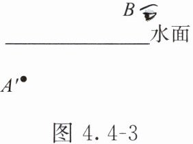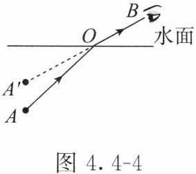 $B$ 处;先连接 $B$、$A'$ 两点,与水面交于 $O$ 点,则 $O$ 为入射点;连接 $AO$,标上箭头为入射光线,则 $OB$ 为折射光线,并标上箭头,如图 4.4 - 4 所示。答案 如图 4.4 - 4 所示。