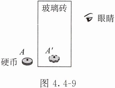 5. 小文表演趣味小实验。如图 4.4 - 9 所示,她将一块厚玻璃砖竖立在桌面上,让小明站在玻璃砖的右侧进行观察。小文将一枚硬币缓慢移至玻璃砖左侧某一位置时,小明惊奇地发现,硬币“进入”玻璃砖内了。请画出从 $A$ 点出发的一条光线,经过玻璃砖进入眼睛的完整光路。