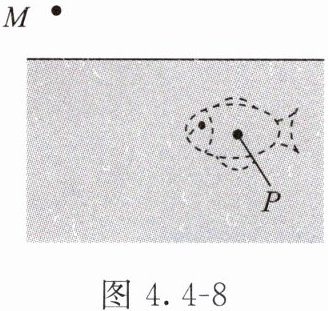 3. 如图 4.4 - 8 所示,人眼在岸上 $M$ 点看到水中 $P$ 点有一条小鱼。若从 $M$ 点射出一束光,使光能照射到真实的小鱼,该束光应射向(
