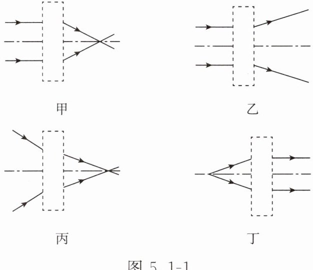 【典例1】在图5.1-1所示虚线框中放入适当的凸透镜或凹透镜,使光路图成立。其中放入凹透镜的是(