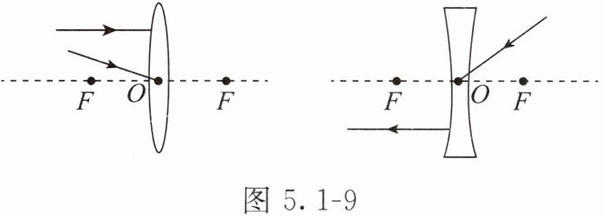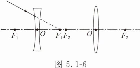 4. 在图5.1-6中,完成入射光线从左边射向凹透镜后,再经凸透镜折射的光路。