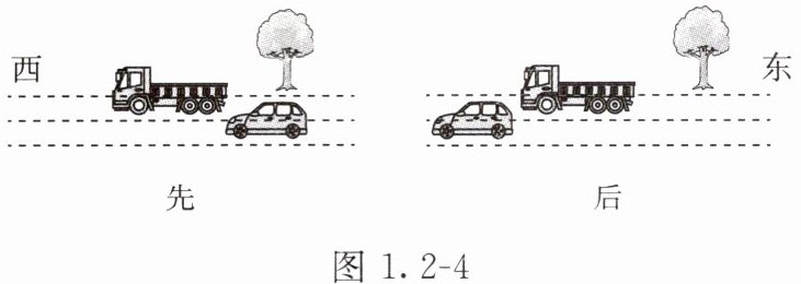 5. 一辆大卡车和一辆小汽车沿平直公路自东向西行驶,站在路边的小明先后两次看到的情景如图 1.2 - 4 所示,下列描述正确的是(