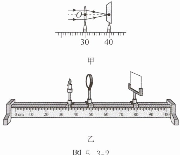 (1)图 5.3 - 2 甲中,平行光经凸透镜后会聚到一点,说明凸透镜对光具有会聚作用,焦点到凸透镜光心的距离叫作焦距,所以焦距为 $ f = 40.0\ cm - 30.0\ cm = 10.0\ cm $。