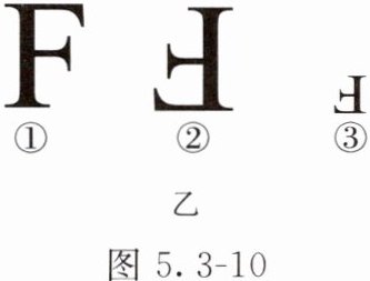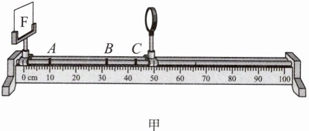 3. 如图 5.3 - 10 甲所示,在“探究凸透镜成像的规律”实验中,选取焦距为 10 cm 的凸透镜,将一个“F”字样 LED 灯依次放在光具座 $ A $、$ B $、$ C $ 三点处,所成像如图 5.3 - 10 乙所示,则人眼在凸透镜右侧观察到的像的先后顺序是(