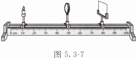 5. 小明做“探究凸透镜成像的规律”实验,实验所用凸透镜的焦距为 $ f = 10\ cm $,他把凸透镜固定在光具座上 50 cm 处,调节蜡烛的烛焰、凸透镜和光屏,使它们的中心在同一高度,如图 5.3 - 7 所示。