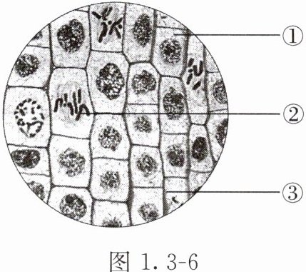 7. 图1.3-6是在显微镜下观察洋葱根尖细胞分裂切片时看到的视野。请据图回答下列问题。