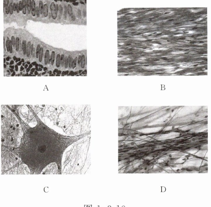 图 1.3 - 10 是某学生在显微镜下观察人体基本组织的永久玻片标本时看到的视野,请据图回答下列问题。