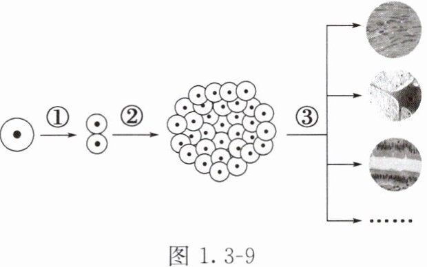 8. 图 1.3 - 9 是受精卵发生的一系列变化过程,请分析回答下列问题。