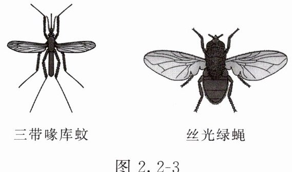 夏季是蚊、蝇繁殖的高峰期。图2.2 - 3是某地常见的蚊、蝇品种。下列有关叙述错误的是(