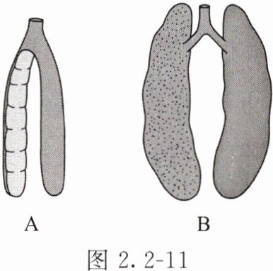 (3)图2.2-11中A和B分别为中国大鲵和扬子鳄肺的结构示意图。与中国大鲵的肺相比,扬子鳄的肺更大,肺泡数量多,大大增加了气体交换的面积。而中国大鲵肺的结构简单,不能满足其对氧气的需求,还需要靠鳃和湿润的