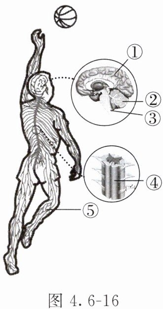 2. 篮球比赛对运动员的智慧和体能都是很大的考验。请结合图4.6-16所示人体神经系统的组成示意图,分析回答下列问题([ ]内填序号):