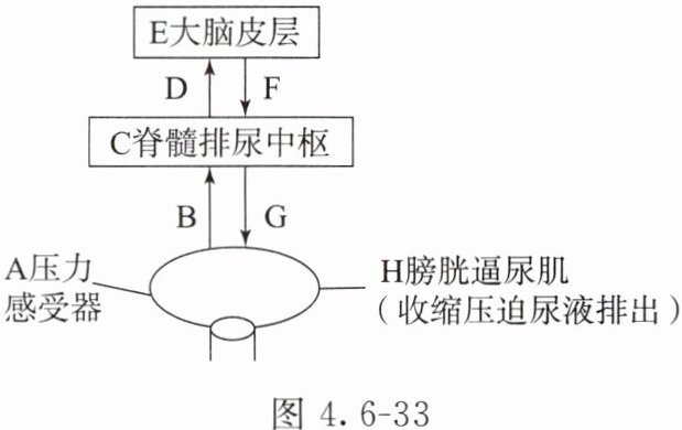 10. 排尿不仅受脊髓的控制,也受大脑皮层的调控。图4.6-33是排尿反射的示意图,据图分析回答下列问题: