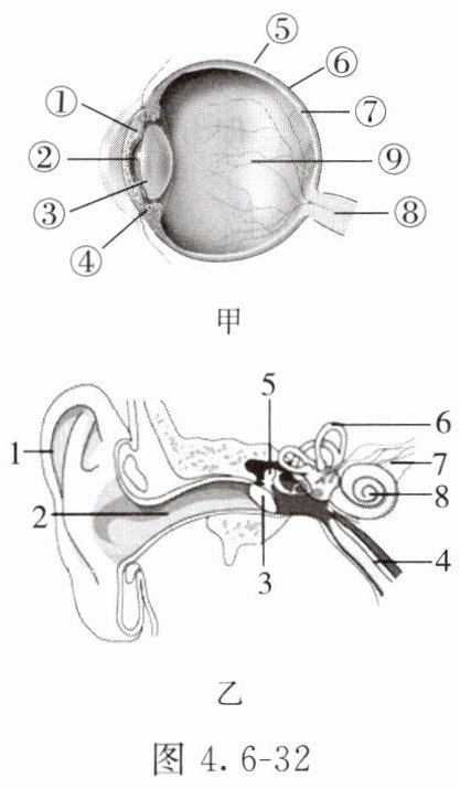 9. 图4.6-32是眼和耳的结构模式图,请据图回答下列问题([ ]内填数字或序号):