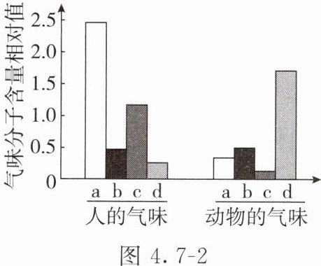 (3)科研人员测定出人和动物的气味均含有多种成分,其中主要气味分子a、b、c和d含量的相对值如图4.7-2所示。据图推测,人的气味中吸引伊蚊的是a和_______两种气味分子,依据是_______。