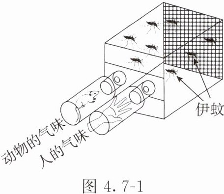 (2)为探究伊蚊如何区别人和动物,科研人员利用如图4.7-1所示装置开展实验。几分钟后发现,伊蚊全部趋向人的气味一侧。科研人员的假设是_______。