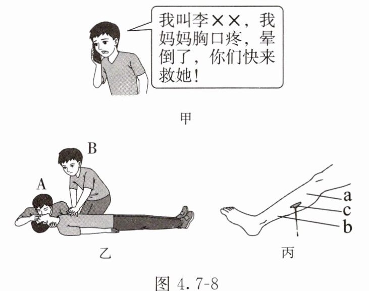 1. 掌握一些必要的急救常识,对于救死扶伤具有重要意义。图 4.7 - 8 所示是生活中的一些危急情况和意外伤害,请你结合学过的知识回答下列问题: