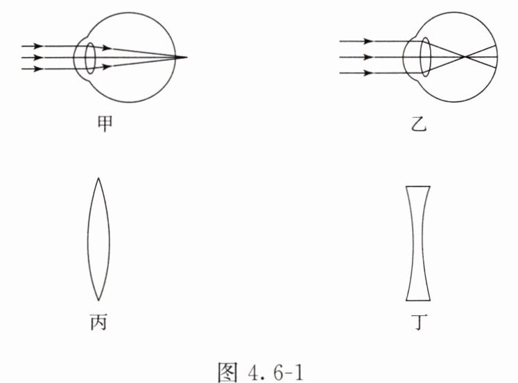 图4.6-1中,甲图和乙图为人眼的两种成像情况,丙图和丁图为两种透镜的示意图,则近视眼的成像情况及矫正近视应该选择的透镜分别是(