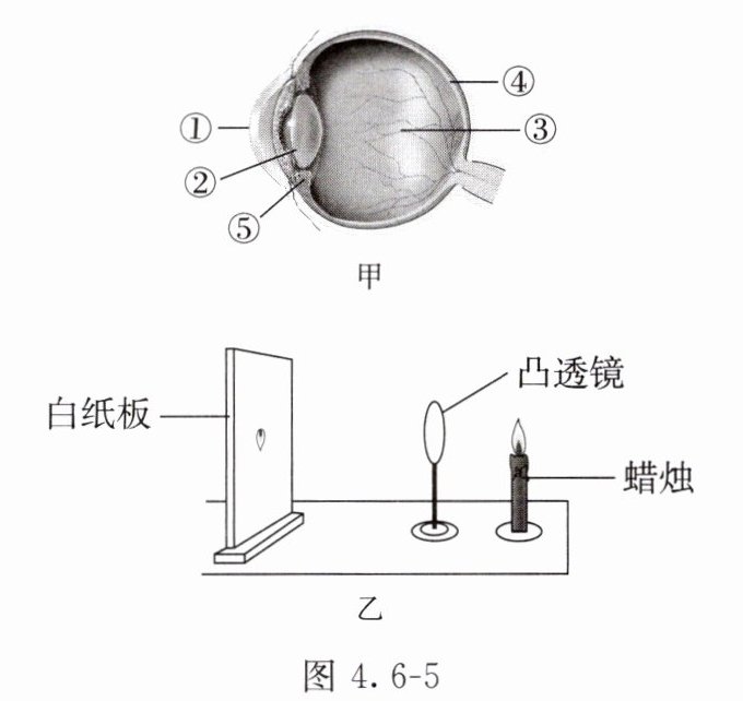 1. 小明在学习了“人体对外界环境的感知”这一节的内容后,绘制了眼球的基本结构示意图(图4.6-5甲),并进行了模拟眼球成像实验(图4.6-5乙),请据图分析回答下列问题([ ]内填序号):