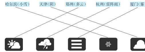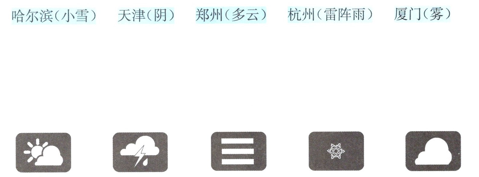 哈尔滨(小雪) 天津(阴) 郑州(多云) 杭州(雷阵雨) 厦门(雾)