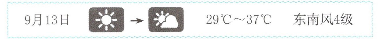 9月13日→ $29^{\circ}C\sim37^{\circ}C$ 东南风4级