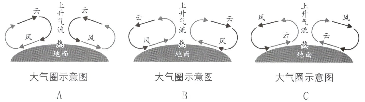 6. 下列图示中,( )正确描述了大气圈中风和云的位置。