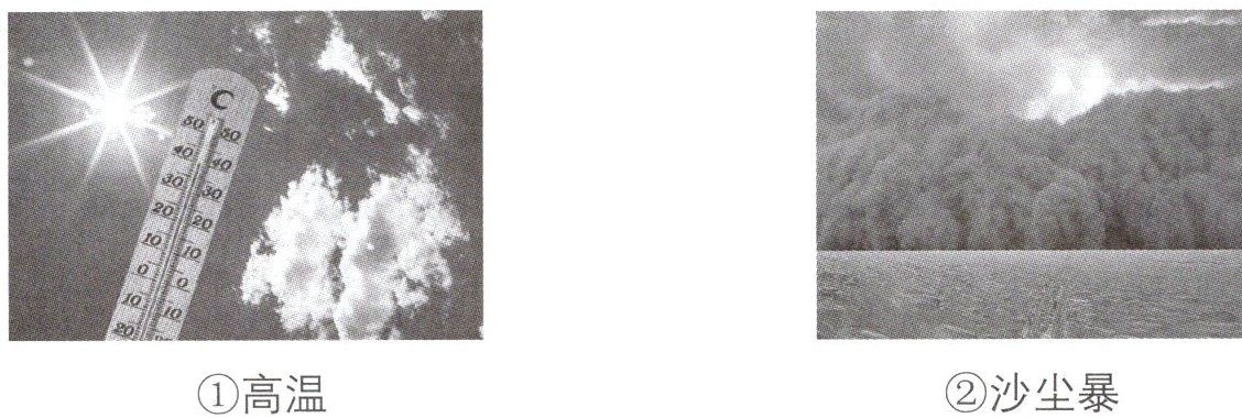 例:①高温出行易中暑,需做好防晒;食物容易变质。②风挟带的沙尘影响人体健康,容易引起哮喘、气管炎等;干扰出行,能见度低,增加交通事故风险。