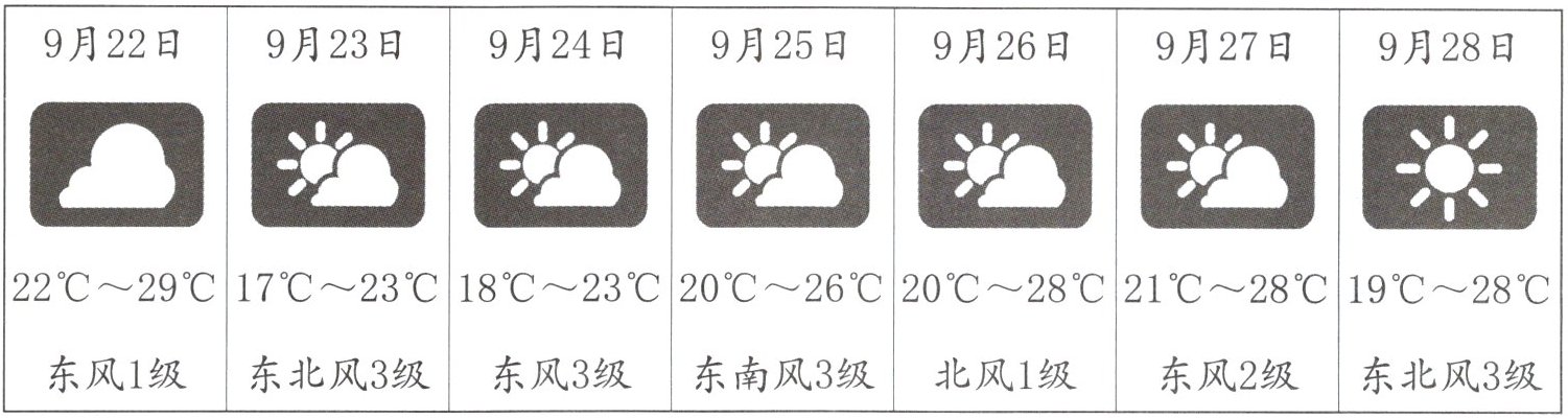 天气和我们的生活息息相关。下图是蓝蓝收集的所在地区一周的天气预报,请观察分析,回答问题。