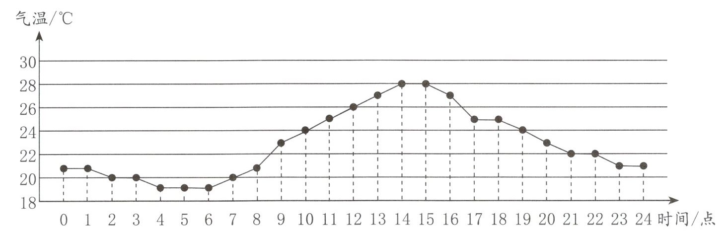 1.多云,最低气温21℃,最高气温28℃,东风2级。2.深夜0点~4点气温逐渐降低,凌晨4点~6点气温为当日最低,6点~14点气温逐渐上升,14点~15点气温为当日最高;15点~24点气温逐渐降低。3.①做好遮阳防晒准备;②携带饮用水;③温差大,带合适的外套。(答案合理即可)