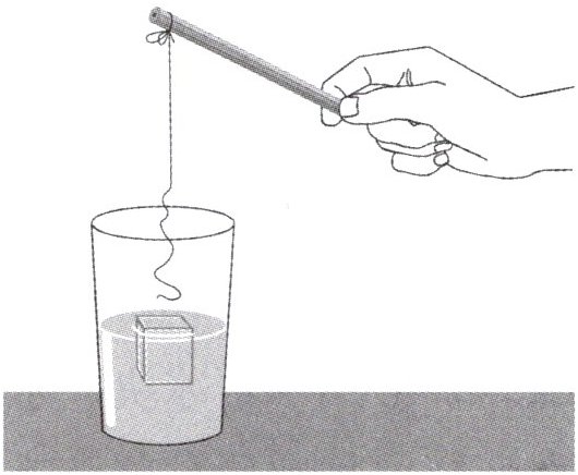 在一个杯子里装上水,让一个小冰块漂浮在水上。想一想,如何才能用这根没有钩的“钓竿”把冰块钓上来呢?