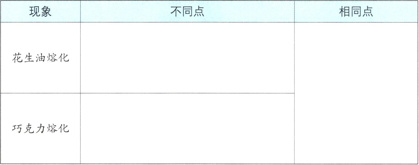 1.不同点:花生油是在自然温度变化下发生的物态变化,颜色由乳白色变成淡黄色。巧克力是人为控制温度实现的物态变化,颜色无明显变化。