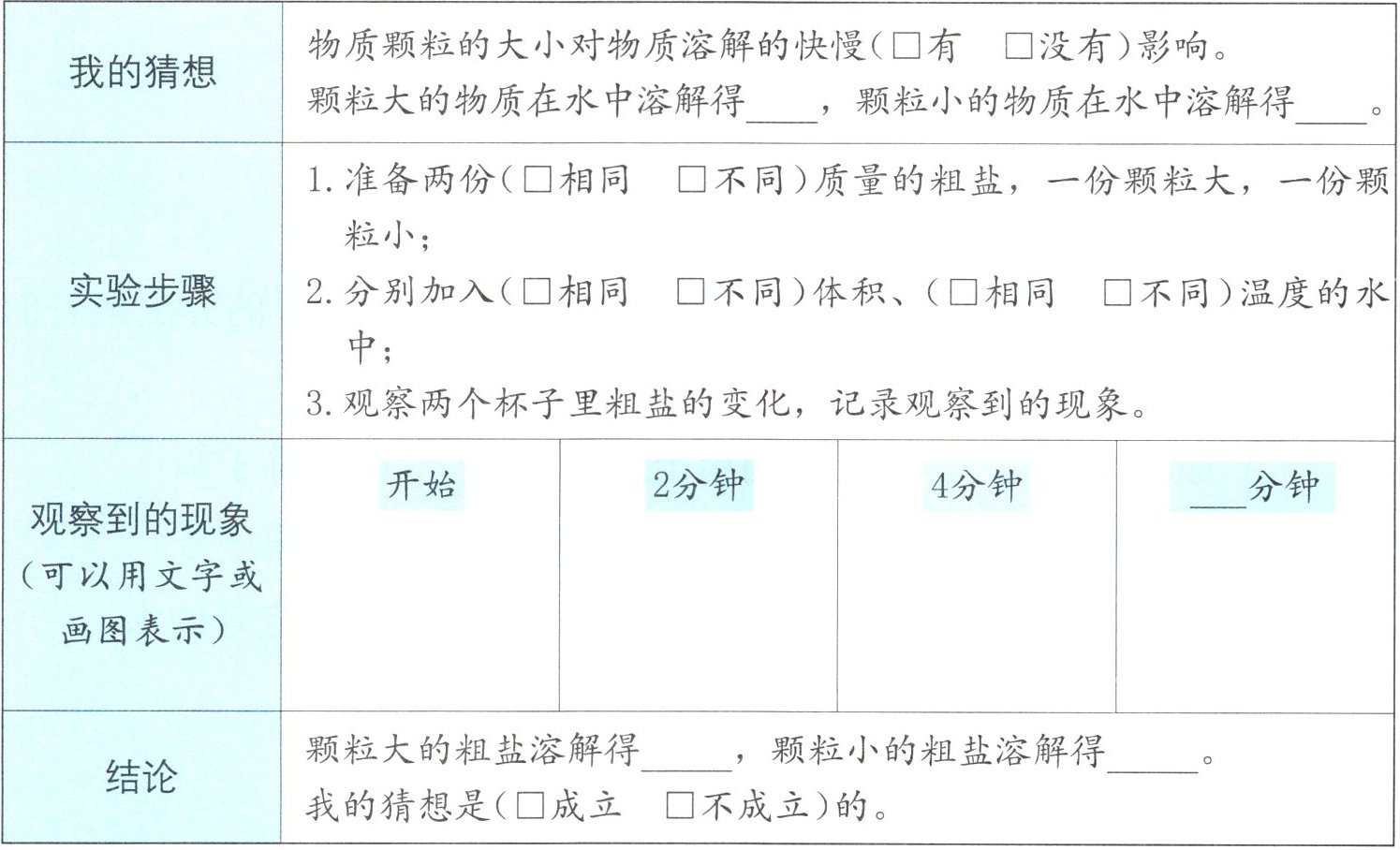|我的猜想|物质颗粒的大小对物质溶解的快慢(□有 □没有)影响。