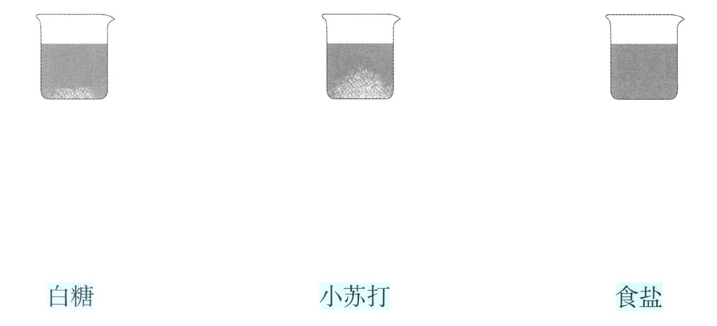 $20^{\circ}C$时,$100$毫升水中最多能溶解的物质质量不同:约$204$克白糖、约$10$克小苏打、约$36$克食盐。将同样质量的白糖、小苏打和食盐分别放入$100$毫升的水中,充分搅拌后得到了如下图所示的实验结果。请你将这三种物质与相应的实验结果连一连。