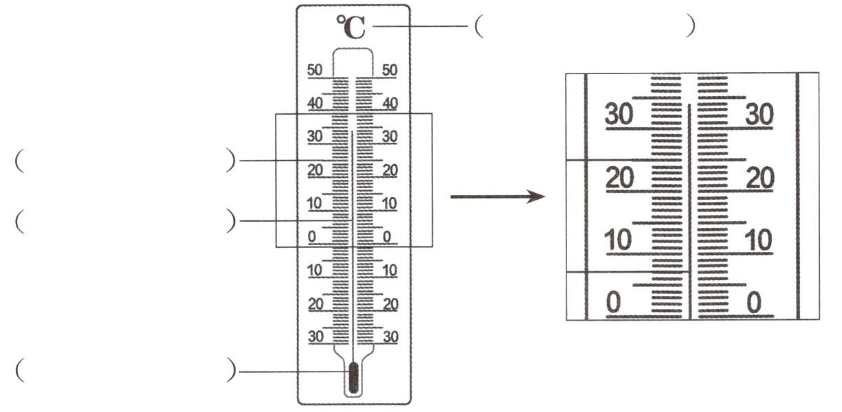 1.由上至下:单位符号 刻度 液柱 玻璃泡 2.50℃ -30℃ 1℃ 34℃