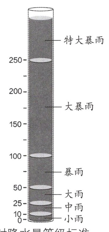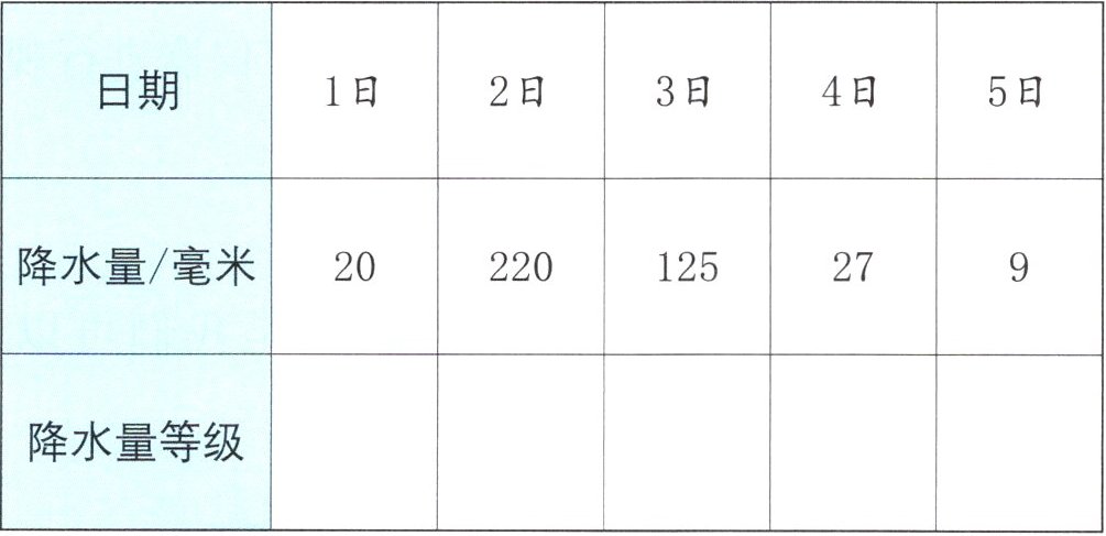 三、下表是蓝蓝查阅的某地连续5日的降水量。请你对照右边的“24小时降水量等级标准”(单位:毫米),确定这5日的降水量等级。