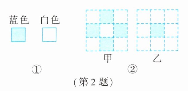 2. 手工课上,同学们用图①中的蓝色和白色正方形纸片拼成图②中的甲、乙两种图案。现有 50 个蓝色正方形纸片和 130 个白色正方形纸片,若拼成两种图案(两种图案都要拼)若干,恰好将所有正方形纸片用完。设拼成了 $ x $ 个甲图案,$ y $ 个乙图案,填写下表。