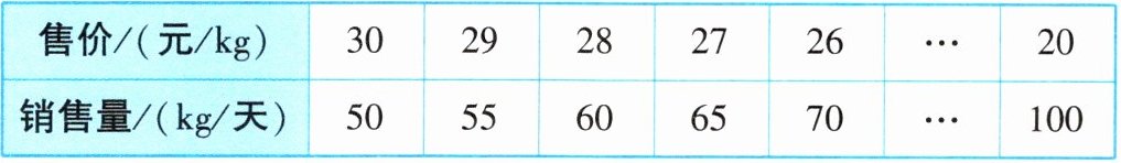 (2)当$y=85$时,$5x+50=85$,解得$x=7$。所以$30-x=30-7=23$(元)。所以这天的售价是每千克$23$元