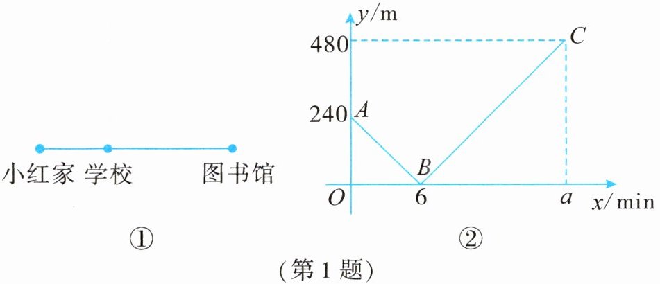 1. 如图①所示,学校在小红家和图书馆之间,小红步行从家出发经过学校匀速前往图书馆。小红步行时距离学校的路程 $ y(m) $ 与行走时间 $ x(min) $ 之间的关系如图②所示。