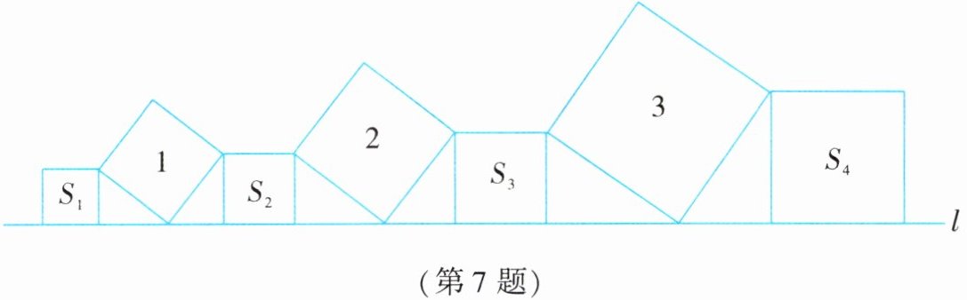 7. 如图所示的是在直线 $l$ 上依次摆放着 $7$ 个正方形。已知斜放的 $3$ 个正方形的面积分别是 $1$,$2$,$3$,正放的 $4$ 个正方形的面积依次是 $S_1$,$S_2$,$S_3$,$S_4$,则 $S_1 + S_2 + S_3 + S_4 =$ 。