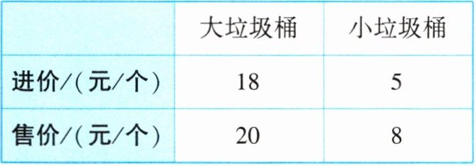 7. 某超市花了$7900$元购进大小不同的两种垃圾桶共$800$个,其中,大垃圾桶和小垃圾桶的进价及售价如下表所示。