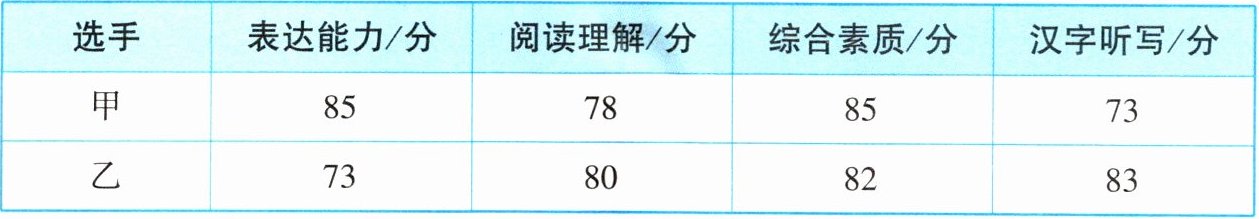 3. 学校准备从甲、乙两位选手中选择一位选手代表学校参加所在地区的汉字听写大赛,学校对两位选手从表达能力、阅读理解、综合素质和汉字听写四个方面做了测试,他们各自的成绩(百分制)如下表。