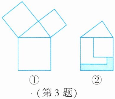 3. 勾股定理是人类伟大的科学发现之一,在我国古算书《周髀算经》中早有记载。如图①,以直角三角形的各边为边分别向外作正方形,再把较小的两张正方形纸片按图②的方式放置在最大的正方形内。若知道图中阴影部分的面积,则一定能求出(