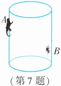 7. 如图,圆柱形容器的高为 $ 1.2\ m $,底面周长为 $ 1\ m $,在容器内壁,离容器底部 $ 0.3\ m $ 的点 $ B $ 处有一只蚊子,此时一只壁虎正好在容器外壁,离容器上沿 $ 0.3\ m $,且与蚊子相对的点 $ A $ 处,则壁虎捕捉蚊子的最短路程为